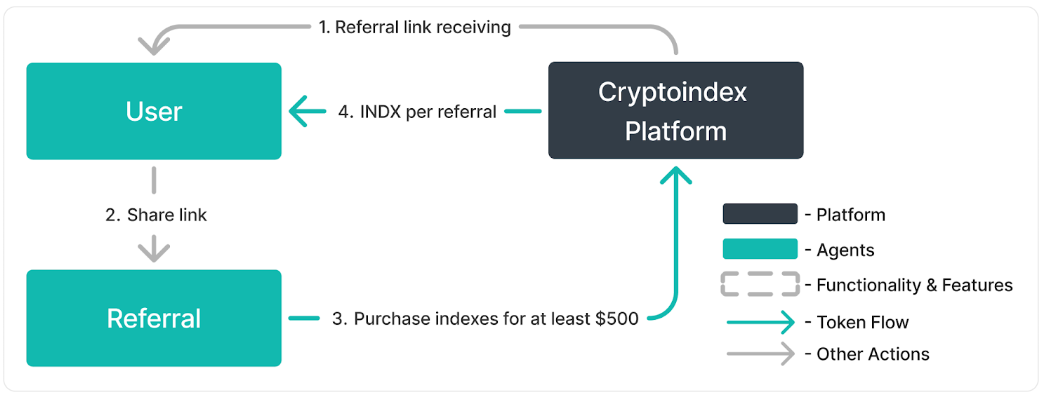 The Cryptoindex platform encourages user growth and engagement through its Referral Program. This program is designed to reward users who invite new participants to join and actively use the platform, fostering a community-driven expansion: